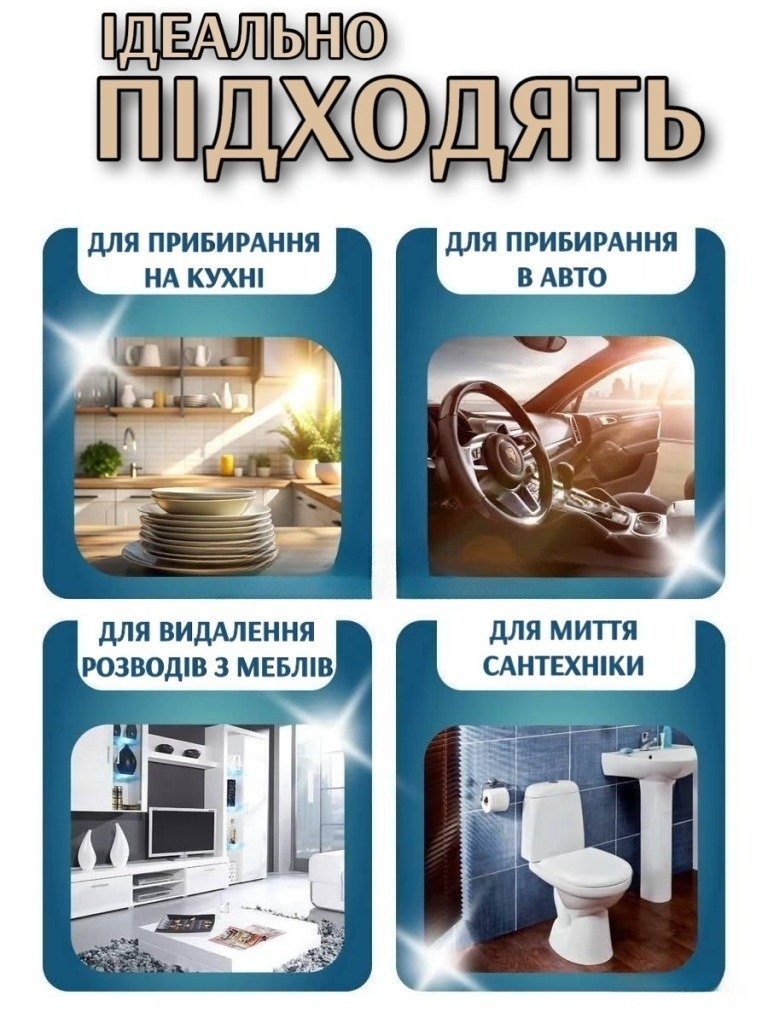 • Підходять для прибирання будинку, миття посуду, протирання скла, дзеркал та інших поверхонь